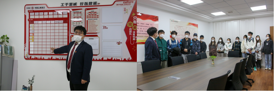 在辽东湾支行,网点行长王永强热烈欢迎同学们来到支行参观学习,他详细讲解了工行基本特点、日常业务、工作条规及工作理念等,让学生对工商银行有了更加完整直观的了解。