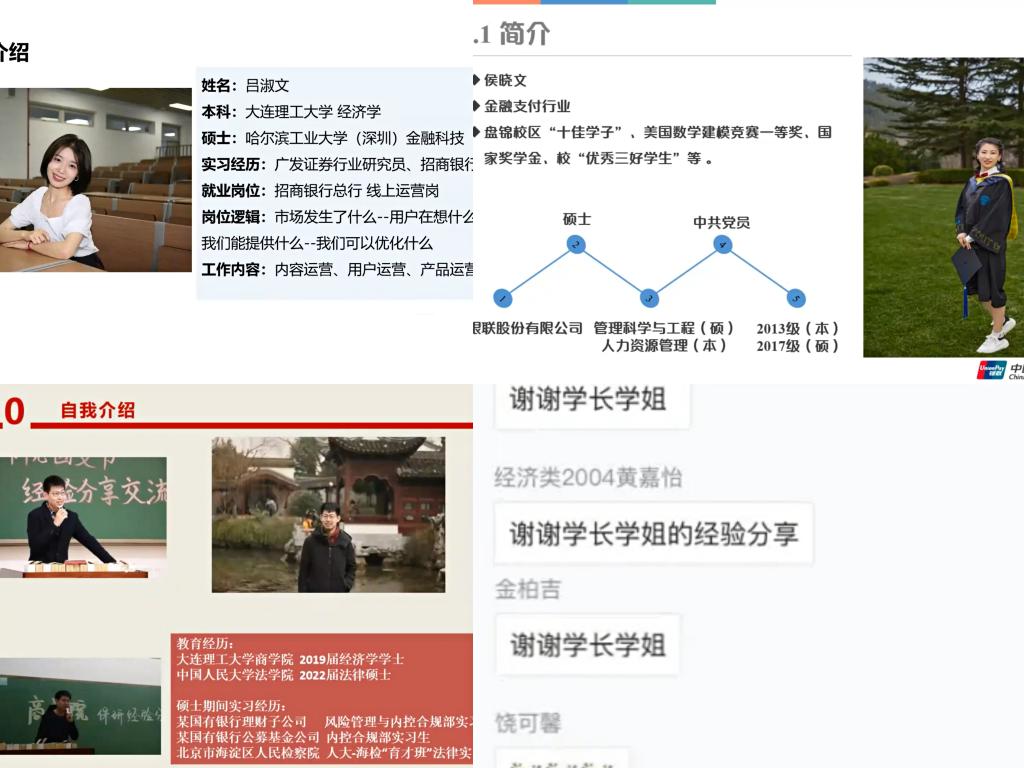 2019届经济学专业毕业生吴津锋先对金融业、银行两个方向进行简要介绍,然后详细讲解了内控合规细分工作条线相关内容,并针对求职流程、国企与公务员备考等分享了自己的经验。2017届人力资源管理专业毕业生侯晓文首先对金融支付行业进行了简要介绍,又从行为适配度、专业适配度两个方面对三个专业进行整体分析,并向同学们提出建议:努力学习、提高成绩、锻炼能力,是大学期间作为一名学生应当做好的事情。2019届经济学专业毕业生吕淑文从优势、劣势两个方面分别对三个专业进行详细介绍,建议同学们课余时间学习一项技能,不断充实自我;在就业或深造选择上,她建议同学们提前做好规划早日付诸行动。