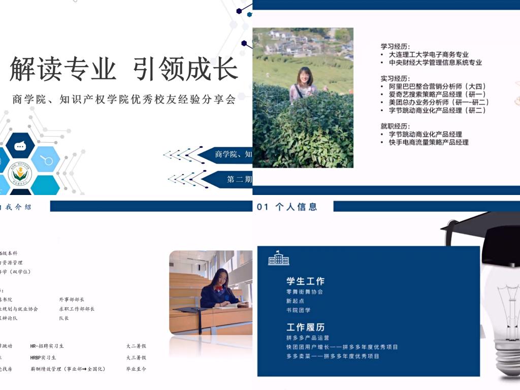 2019届电子商务专业毕业生袁璐对电商行业进行系统介绍,阐述了电商行业的职业划分,同时介绍了产品以及产品经理的工作实质,最后分享了专业应用方面的内容,并对其中一些岗位及专业课程进行了详细阐述。2020届人力资源管理专业毕业生孙妍对人力资源管理专业进行解读,与同学们分享了自己从选择经济学双学位到考取心理咨询师证书再到不断寻找实习的过程。最后,她向同学们提出建议:勇于试错、珍惜当下,保持积极乐观的态度尤为重要。2019届电子商务专业毕业生吕亚锋分享了自己当年选择专业时的思考和规划,借此鼓励同学们勇敢前行、努力奋斗;建议同学们要自信并且勇于尝试,强调了培养自身能力的重要性;然后分享了自己的实习经历,表达了对学弟学妹们的美好祝愿。