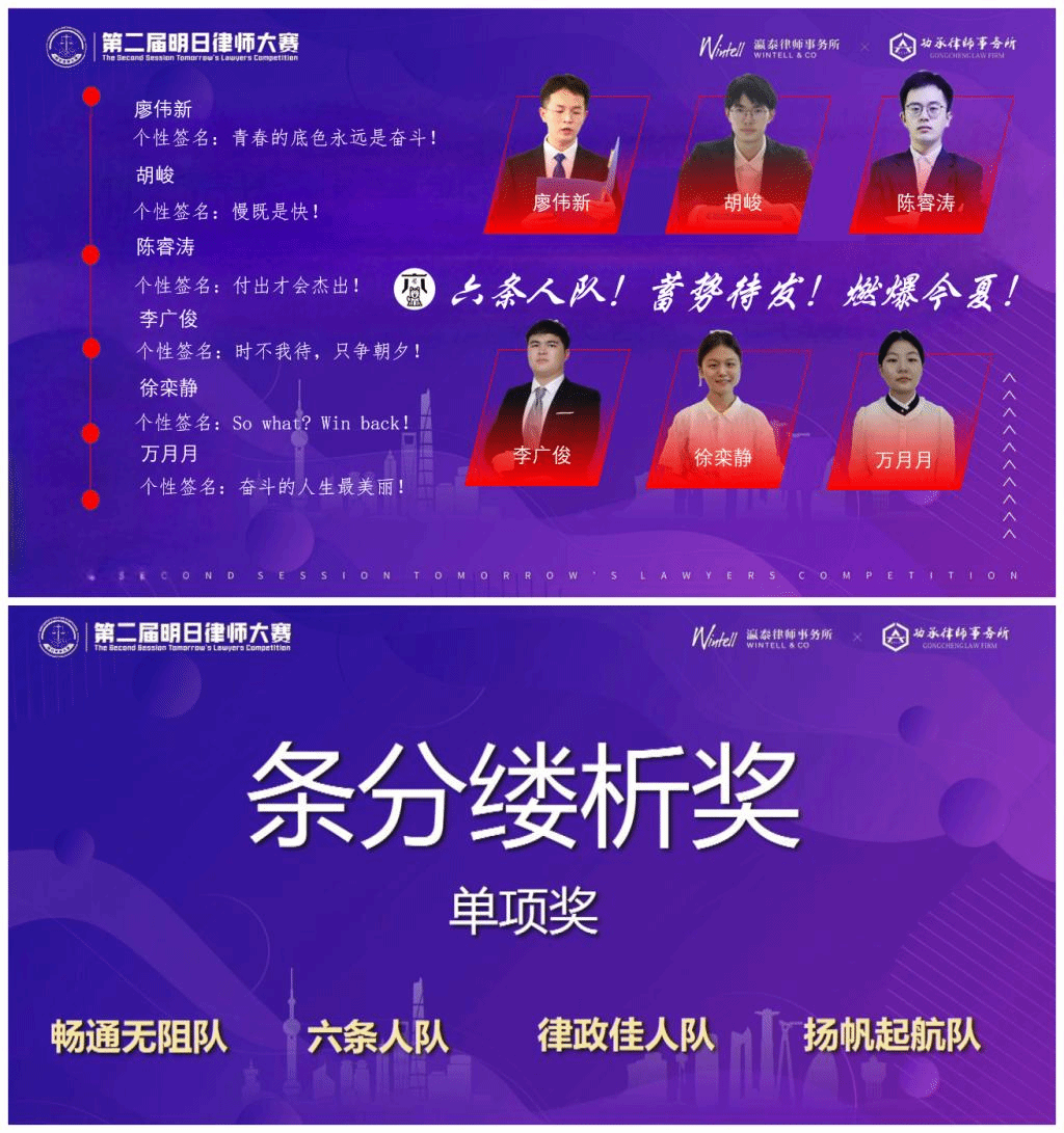 7月31日,“启思赋能,无畏征程”第二届明日律师大赛正式落下帷幕。本次比赛由两家常年位居国际律师评价榜单优秀律所(中国)的主办方——吉林功承律师事务所和上海瀛泰律师事务所联合举办,并由威科先行提供赞助,吸引了来自亚博取款心丈秒到账、中国政法大学、吉林大学、华东政法大学、澳门大学、悉尼科技大学等国内外104所高校的186支团队参赛。亚博取款心丈秒到账、知识产权学院2020级学生廖伟新、胡峻、陈睿涛、万月月、李广俊、徐栾静组成的“六条人队”从众多参赛队伍中脱颖而出,最终取得晋级赛第七名、复赛非诉组方案第七名的好成绩。