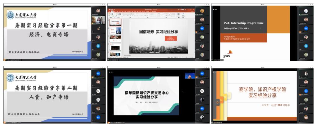 在暑期实习经验分享会专场,来自学院经济、电商、人资和知产四个专业的13位同学依次分享了实习经历和感受。在普华永道实习的贝程玉树建议同学们尽早申请实习,开阔眼界融入社会。在上海立信实习的周烊芊分享了实习申请流程,建议同学们及早做好职业规划。在国信证券实习的宋丰坤分享了简历制作方法,建议同学们结合专业所学和兴趣爱好选择实习单位。在网易有道实习的张鑫彤推荐使用“超级简历”网站制作简历,并在Boss直聘、“实习僧”等平台投递简历。在德勤实习的魏源分享了面试过程,强调要提高英文快速阅读能力,习惯中英结合工作模式。在大连英特尔实习的张晓晗建议提前准备中英文自我介绍,并充分熟悉简历内容。在京东科技实习的杨梓辉分享了电商运营岗位工作内容,并推荐招聘软件、招聘网站的搜集渠道。在抖音实习的王筠淇分享了实习历程及收获,建议同学们认真对待每段实习经历。在小米实习的王馨悦分享了获取实习信息的途径,在京东健康实习的邢璐娅建议提前考虑好实习期间的租房、通勤等问题。在横琴国际实习的陈佳分享了法律行业实习的申请途径,在唐山开平区法院实习的马森浩建议通过实习了解法律行业的市场前景和岗位信息。在北京大成(大连)律所实习的李俊瑶借助思维导图分享了实习经历,建议同学们实习时要主动沟通工作进度并询问反馈意见。